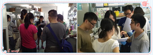 收集好血液樣本后, 每個小組根據protocol開始實驗操作,指導人員對關鍵步驟進行說明并進行演示,加樣,溶紅,加抗體混勻,洗滌,避光孵育等步驟。
