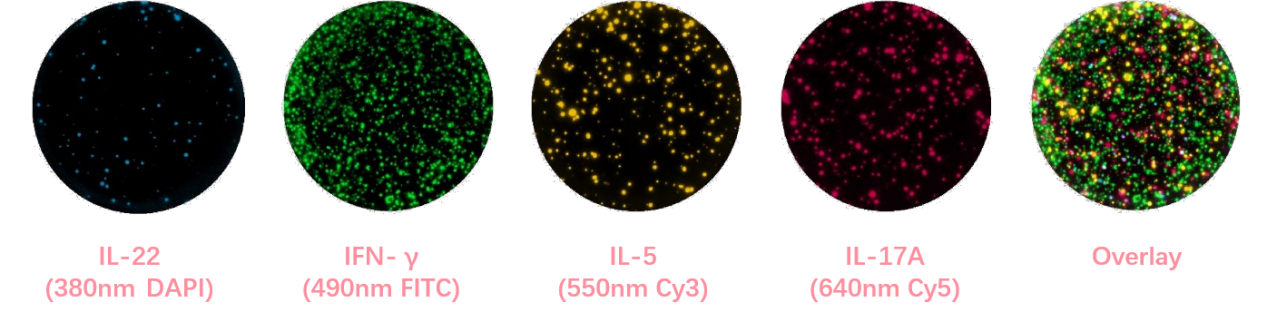 該圖為Mabtech FluoroSpot Plus: Human IL-22/IFN-γ/IL-5/IL-17A(Cat#FSP-18010803-2)的實驗結果,四個檢測通道對應的DAPI,FITC,Cy3,Cy5。