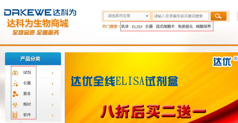 在生物城首頁可以點擊“產品目錄”,或者進入生物商城,通過分類或者搜索來查找產品
