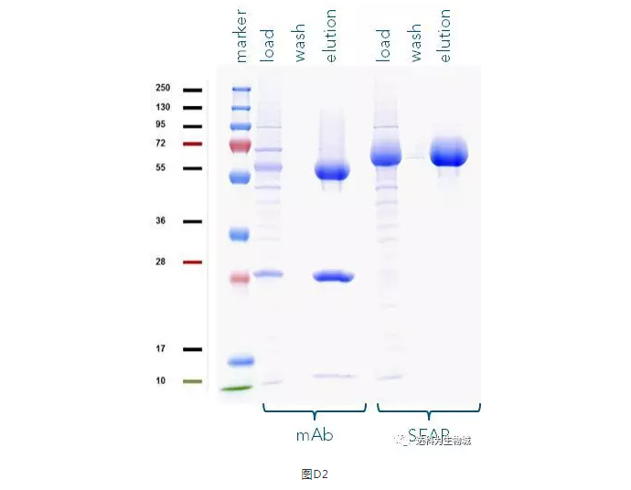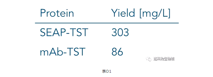 除了上述實驗所用的CHO細胞株外(中國倉鼠卵巢細胞),另一常用于生產蛋白的哺乳動物細胞株為HEK293(人胚胎腎細胞),使用上較CHO簡單。我們測試了Strep-Tactin?XT的純化表現:表D1為以Expi293表達SEAP-TST或mAb-TST蛋白后,目標蛋白的濃度。圖D2為純化表現的SDS-PAGE分析。從中可知,與ExpiCHO培養基相同,直接將表達好的Expi293上清加入1ml Strep-Tactin?XT高載量重力柱中進行純化,一樣能夠快速的得到高純度的目標蛋白。