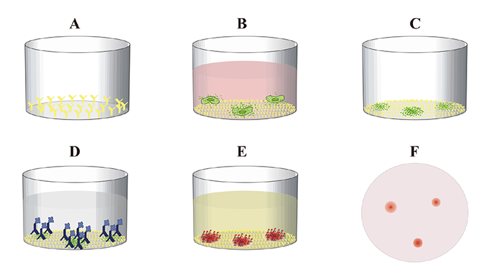 • 加入酶標記的檢測抗體,檢測抗體和 “影像”上的細胞因子結合,形成“抗體-抗原-抗體”夾心結構;
