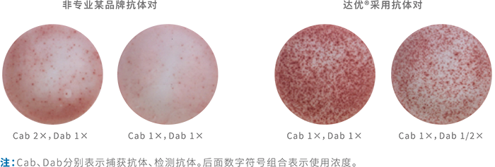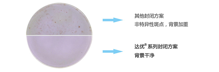 不同的檢測樣本在板孔培養過程中,受各種實驗條件影響,如果封閉不當都可能產生非特異性顯色,導致非特異性斑點的產生或者背景顏色的加重。這將直接影響到最后結果的判斷分析。達優?系列產品通過大量實驗,對不同來源、不同配方封閉方法進行封閉效果的對比試驗,篩選出更高效的封閉系統,并將之運用到系列試劑盒產品中。