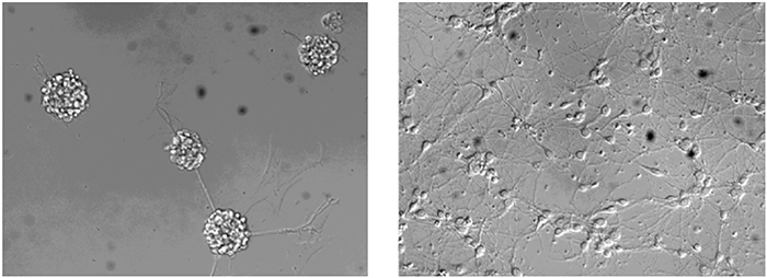 人Midkine增強了培養三天的大鼠胚胎(E18)皮層神經元的神經突起生長;左(未處理),右(0.4 μg/mL的人Midkine)