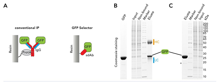 傳統的GFP融合蛋白免疫沉淀是基于與GFP特異性抗體非共價鏈接的protein A或protein G結合在固相,從而拉下蛋白的原理(見圖1 A),其產率和效率通常受限于一抗的特異性和固相上protein A/G的結合能力。通常,在用SDS緩沖液洗脫時,抗體發生變性并與GFP融合蛋白及相互作用的配體一起從樹脂上分離下來。因此,洗脫液中通常含大量一抗重鏈和輕鏈見圖1 B,妨礙鑒定蛋白的相互作用,還有可能影響下游實驗,比如蛋白質印跡或質譜分析。