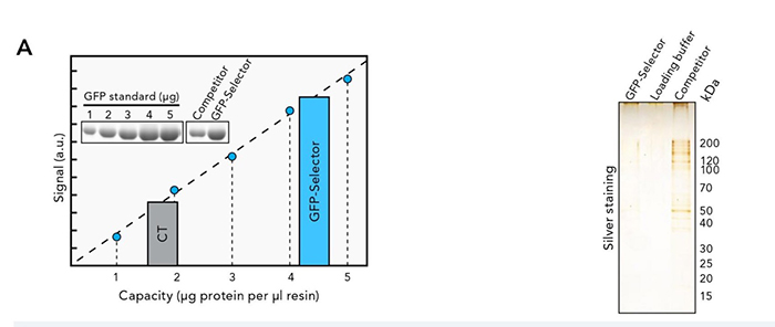 • 將相同體積的GFP selector和競爭產品分別與不含任何GFP標記蛋白的HeLa裂解物一起孵育,洗滌后,產物通過SDS-PAGE分離并進行銀染色分析。
