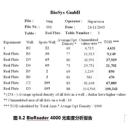 如圖8.2所示,這是BioReader 4000光密度分析報告。它可以提供的信息有:孔的位置、每孔的斑點數目、該孔斑點的平均光密度(Average Opt. Density)、該孔斑點的總面積(Cumulated values area)、該孔相對細胞因子分泌總量(TOD,即光密度總值)。