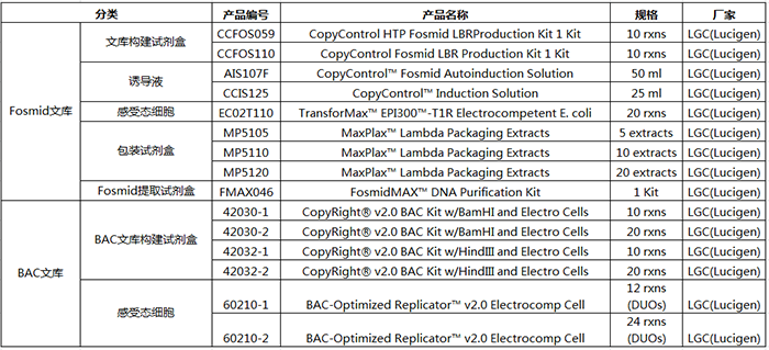 LGC(Lucigen)提供Fosmid文庫構建試劑盒,該試劑盒中的Fosmid載體是行業金標準(原屬于Epicentre產品),可完成各種生物樣本編制完整和無偏向的Fosmid文庫,利用自動誘導液保證單拷貝和誘導高拷貝數量的需要。
