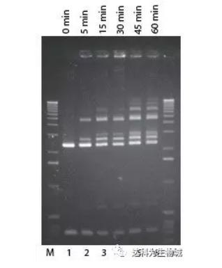 按標準連接反應使用2U Fast-Link? ligase進行Lambda Hind III markers連接(泳道2-6). 泳道M, 1-kb ladder;泳道1,無酶對照;泳道2-6, 分別為5 min, 15 min, 30 min, 1 hr, 2 hr連接結果。