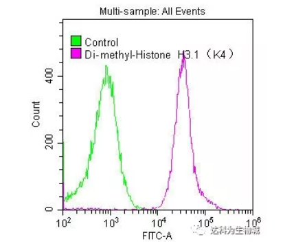 圖4. 使用1:50 稀釋的Histone H3.1K4me2單克隆抗體(貨號:A68400)對HeLa細胞進行染色的覆蓋直方圖。