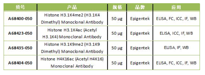 Epigentek提供多種新型兔單克隆抗體,用于表觀遺傳學研究。與傳統的小鼠單克隆抗體相比,這些抗體提供更高親和力,更高特異性,更好地識別抗原表位。