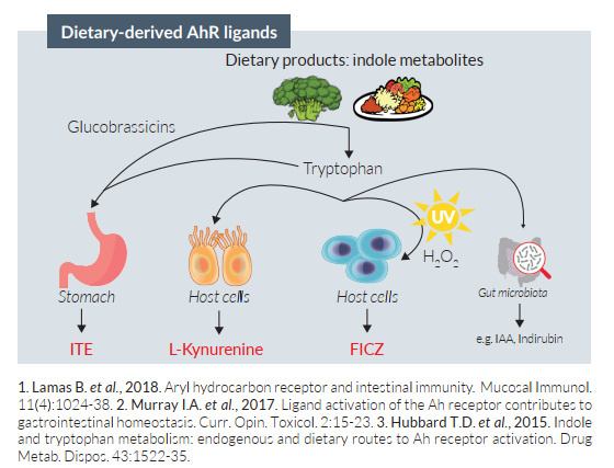 除了像2,3,7,8-四氯雙苯環二噁英(TCDD)的環境中的異質物,多種膳食來源的AhR配體也已經被鑒定出,而其中許多是色氨酸(Trp)氨基酸代謝的副產物4。現在AhR已被認知為宿主微生物群落共生的調節因子。一方面,膳食配體激活的AhR幫助塑造腸道細菌組成5,另一方面,AhR傳感能夠調節腸道免疫細胞的穩態和功能6。