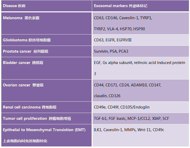 腫瘤細胞和它們的環境之間的直接作用之所以在腫瘤發展進程中至關重要,其中重要的原因就是外泌體在細胞間信號傳遞中起關鍵作用。釋放到細胞外環境的外泌體可以促進血管生成,腫瘤細胞增殖以及血栓形成,除此之外還有細胞外基質的重塑。下面表格中列舉了常見腫瘤的一些外泌體標記。